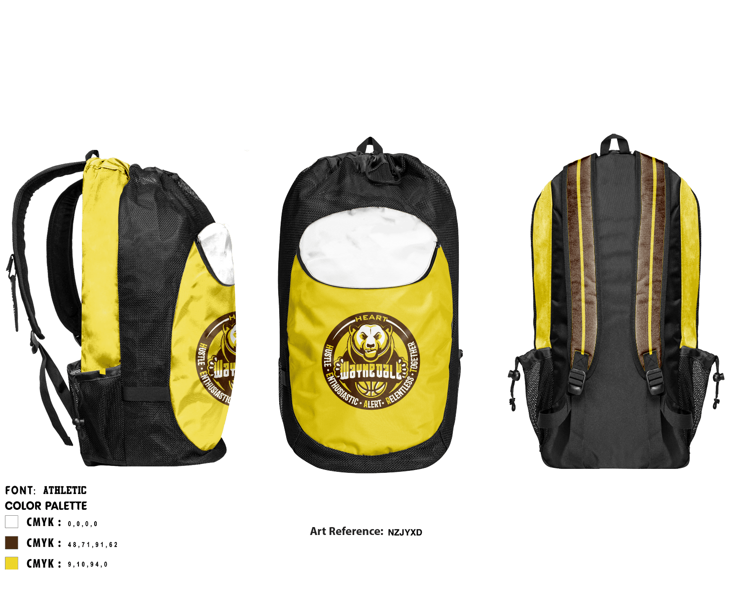 Description: This custom gear bag is perfect for fitting everything that you need - literally. It is a massive bag which features a front pocket with zipper closing, two mesh water bottle holders, two custom backpack straps, mesh side inserts for ventilation, and a draw string closing for the main bag compartment. It will become your favorite sports bag.